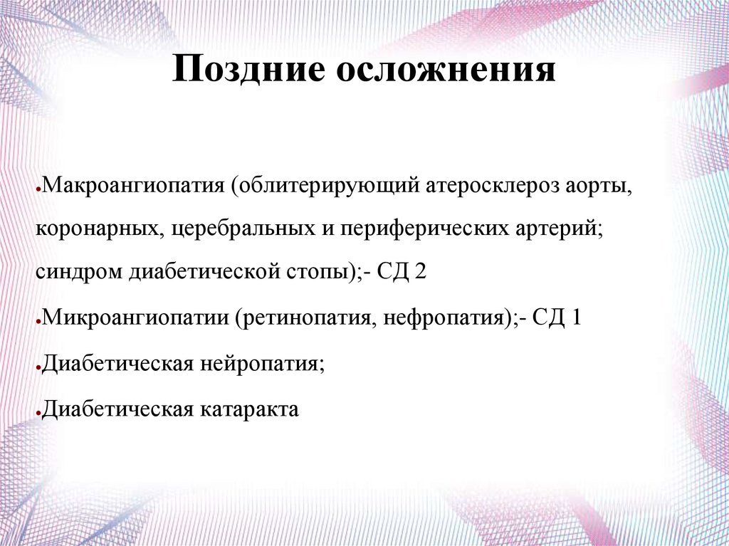 Поздние осложненияМакроангиопатия (облитерирующий атеросклероз аорты,