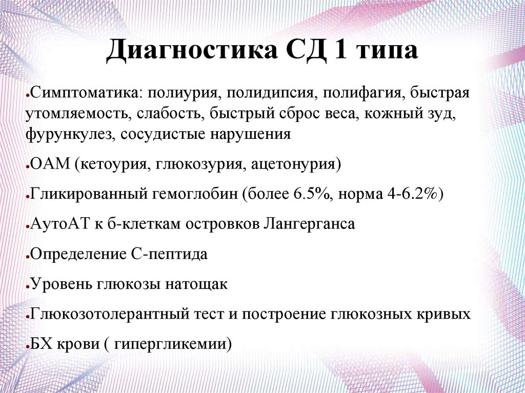 Диагностика СД 1 типаСимптоматика: полиурия, полидипсия, полифагия, быстрая