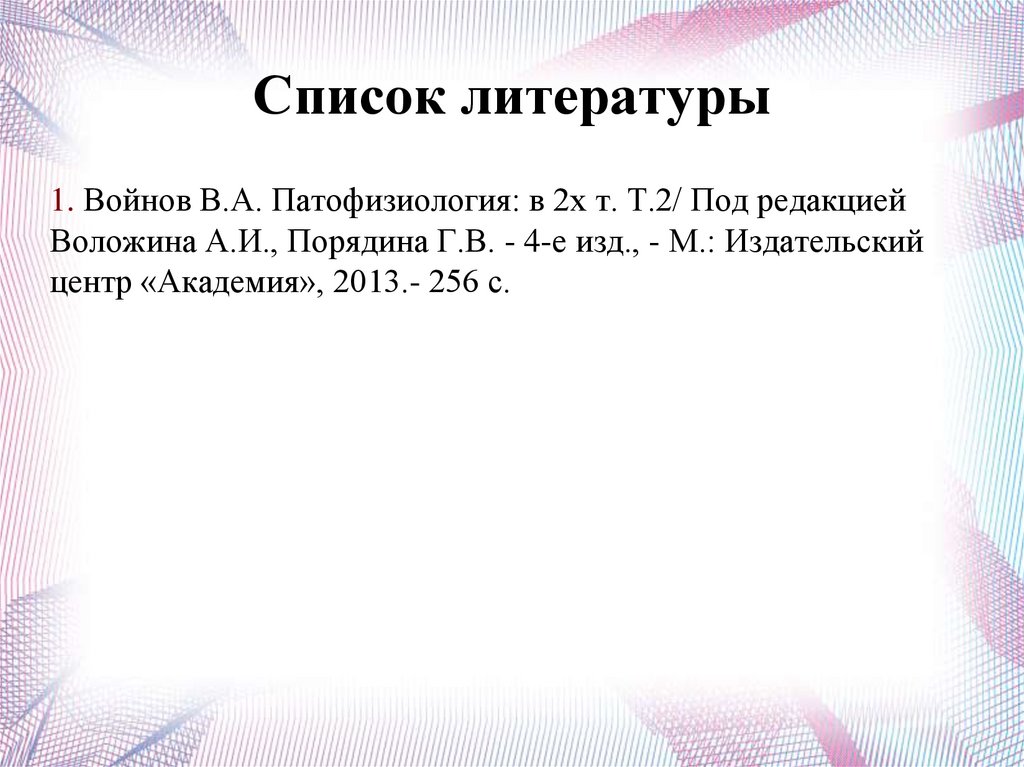 Список литературы1. Войнов В.А. Патофизиология: в 2х т. Т.2/ Под редакцией