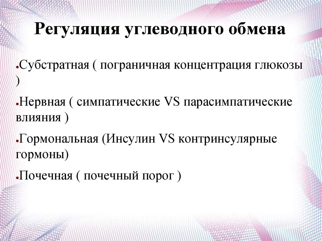 Регуляция углеводного обменаСубстратная ( пограничная концентрация глюкозы