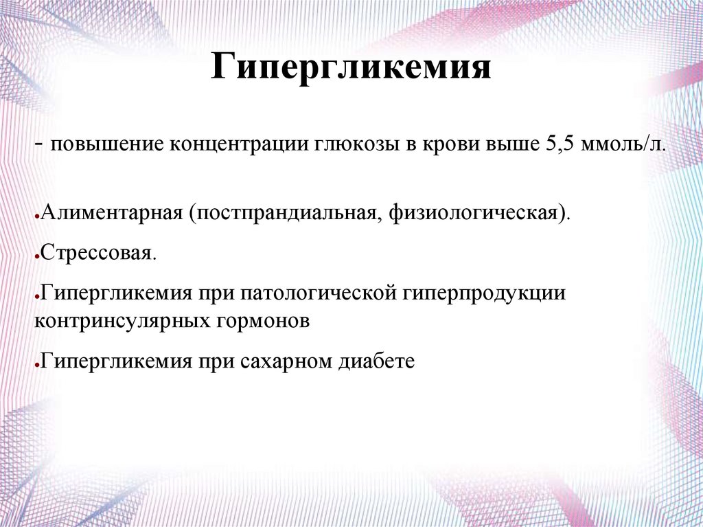 Гипергликемия- повышение концентрации глюкозы в крови выше 5,5 ммоль/л.