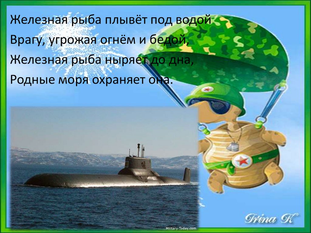 Железная рыба плывёт под водойВрагу, угрожая огнём и бедой,