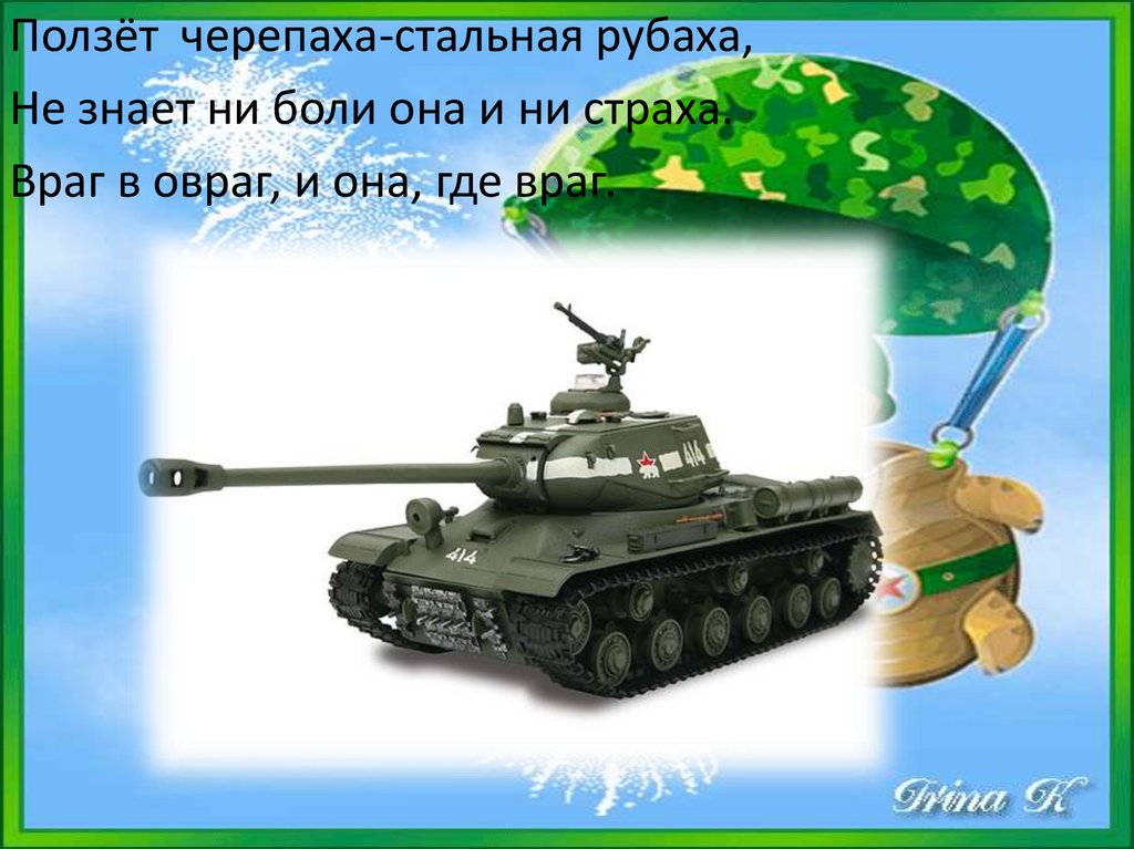 Ползёт черепаха-стальная рубаха,Не знает ни боли она и ни страха.