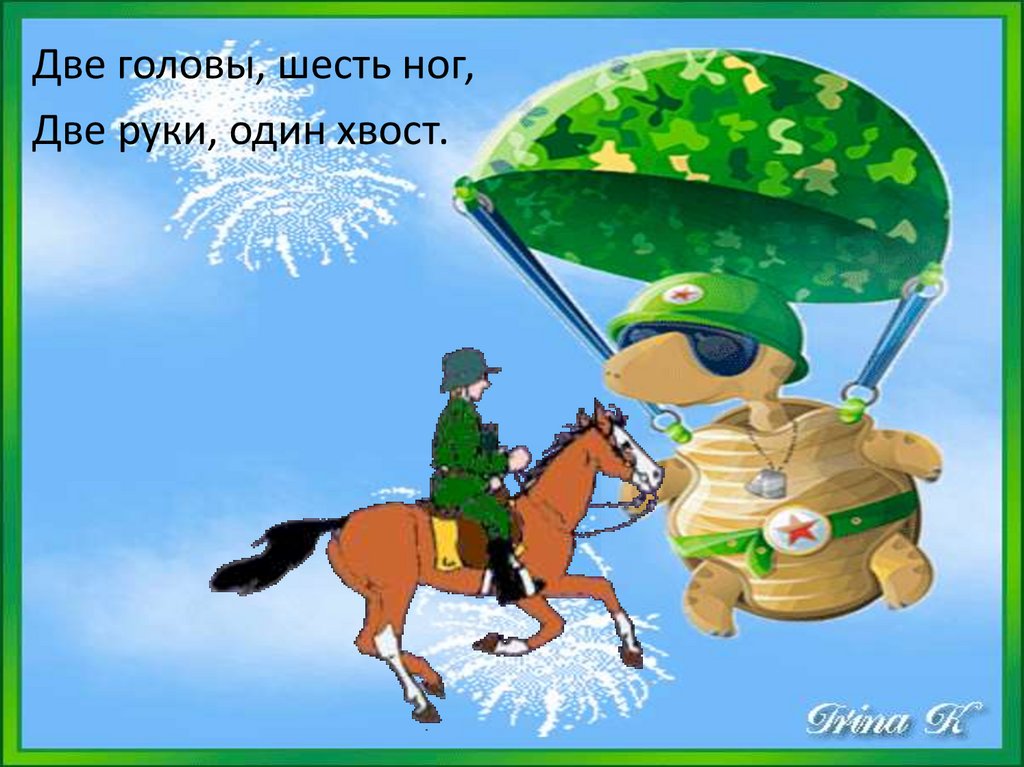 Две головы, шесть ног,Две руки, один хвост.