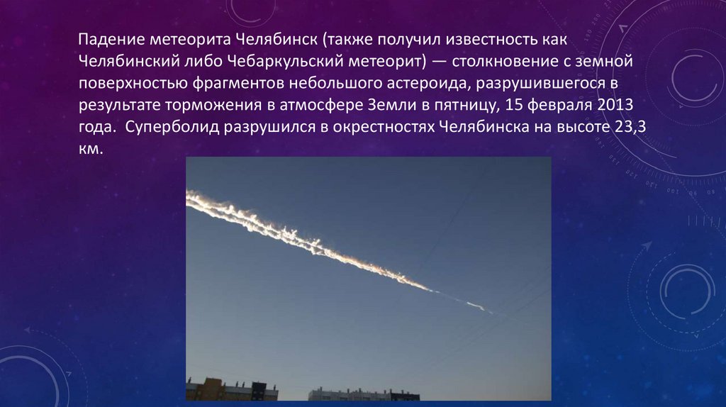 года. Суперболид разрушился в окрестностях Челябинска на высоте 23,3