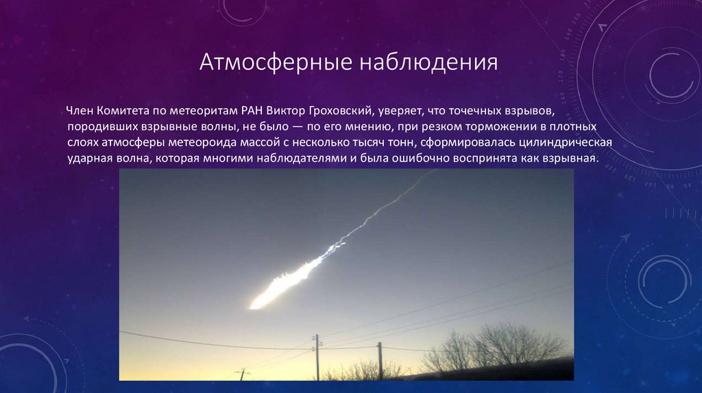 Атмосферные наблюденияЧлен Комитета по метеоритам РАН Виктор Гроховский, уверяет, что точечных взрывов,