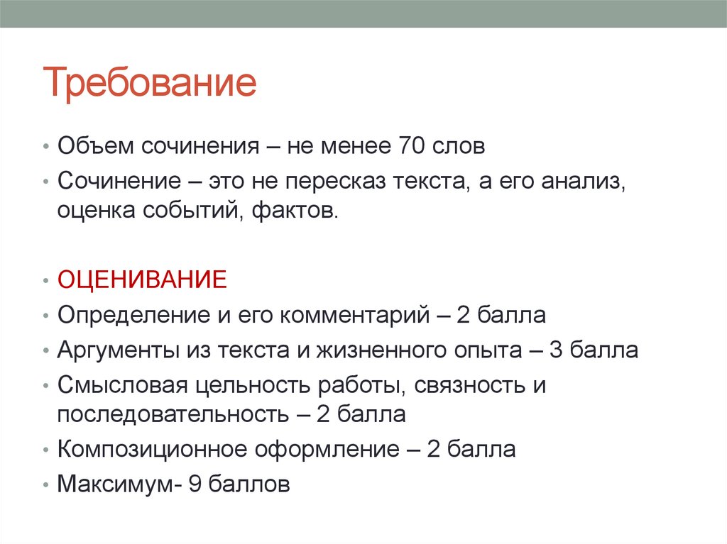 Требование• Объем сочинения – не менее 70 слов