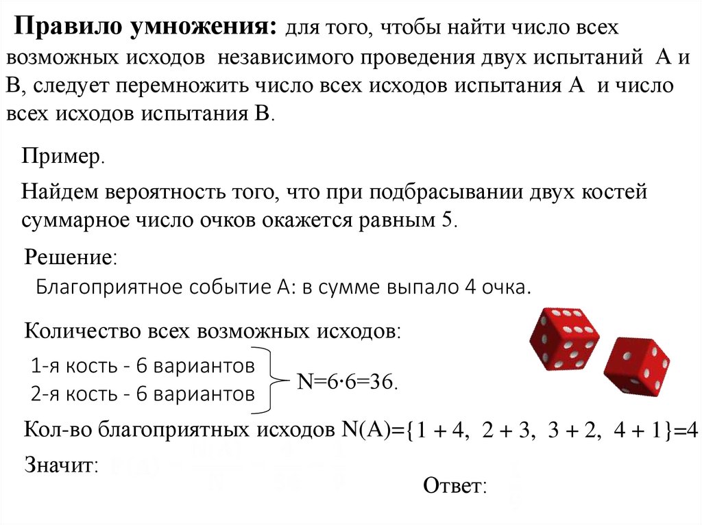 Правило умножения: для того, чтобы найти число всехвозможных исходов независимого проведения двух испытаний А и