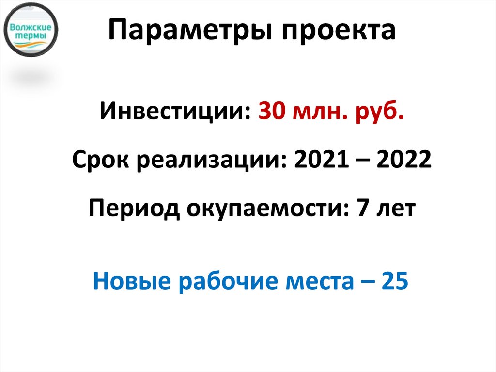 Параметры проектаИнвестиции: 30 млн. руб.