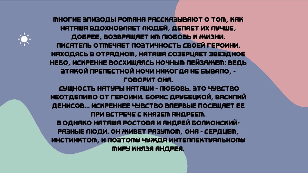 Многие эпизоды романа рассказывают о том, какНаташа вдохновляет людей, делает их лучше,