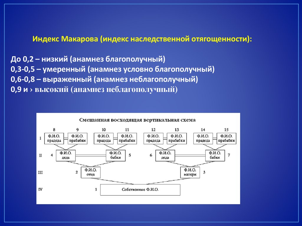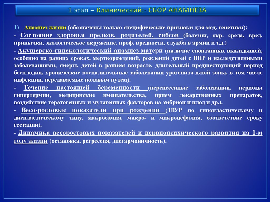 1) Анамнез жизни (обозначены только специфические признаки для мед. генетики):- Состояние здоровья предков, родителей, сибсов (болезни, окр. среда, вред.