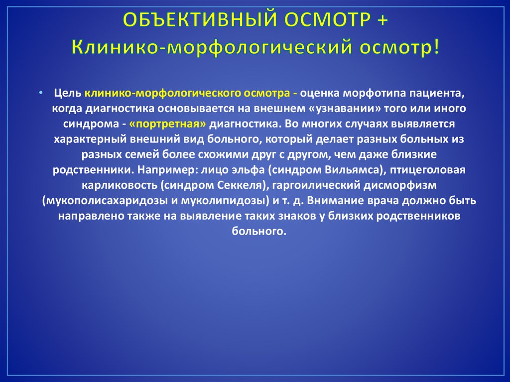 - ОБЪЕКТИВНЫЙ ОСМОТР + Клинико-морфологический осмотр!
