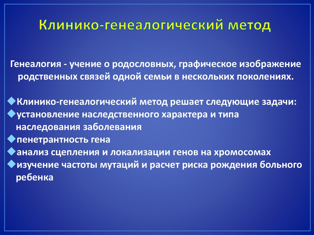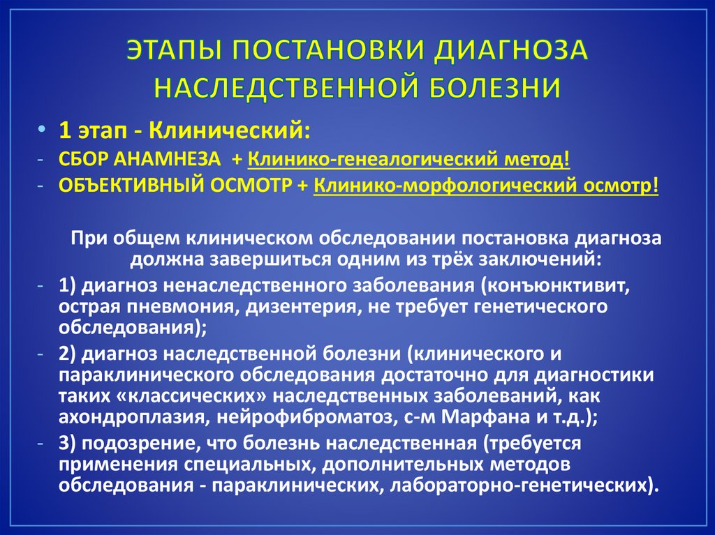 • 1 этап - Клинический:- СБОР АНАМНЕЗА + Клинико-генеалогический метод!