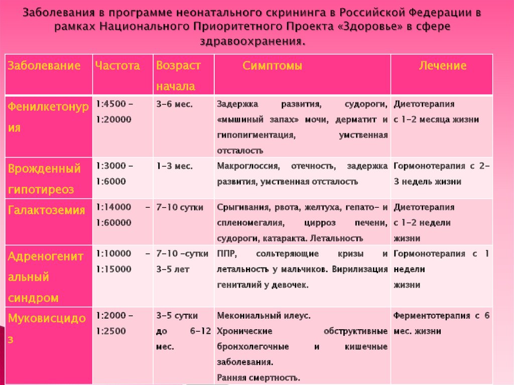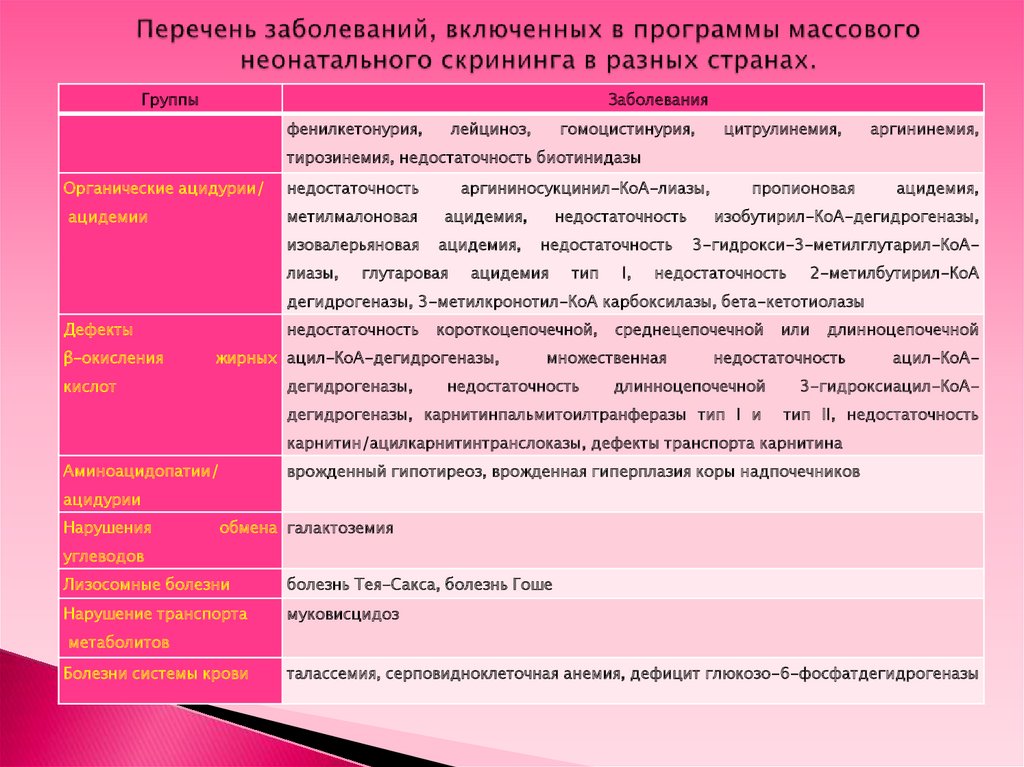 наследственных болезней обмена веществ (К.Д. Краснопольская и соавт.), врождённых пороков развития