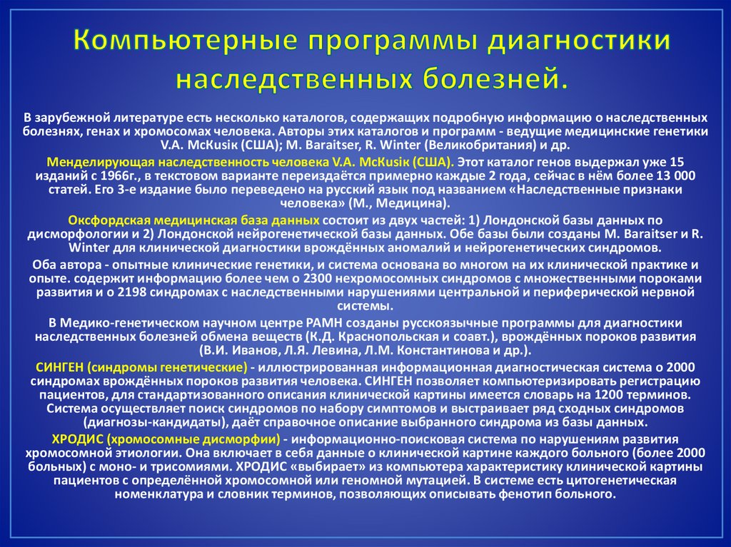 опыте. содержит информацию более чем о 2300 нехромосомных синдромов с множественными пороками