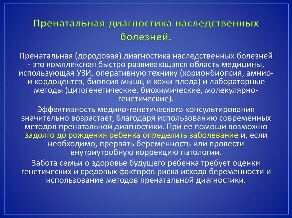 Пренатальная (дородовая) диагностика наследственных болезней- это комплексная быстро развивающаяся область медицины,