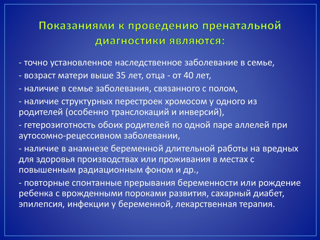 - точно установленное наследственное заболевание в семье,- возраст матери выше 35 лет, отца - от 40 лет,