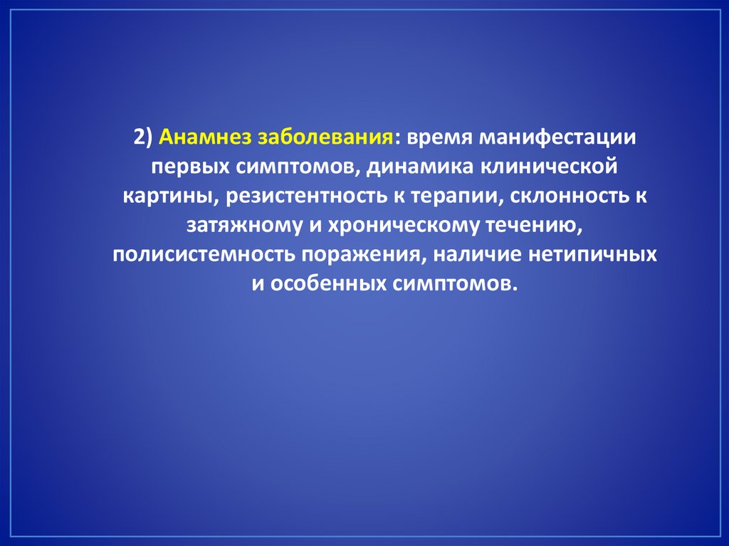 2) Анамнез заболевания: время манифестациипервых симптомов, динамика клинической