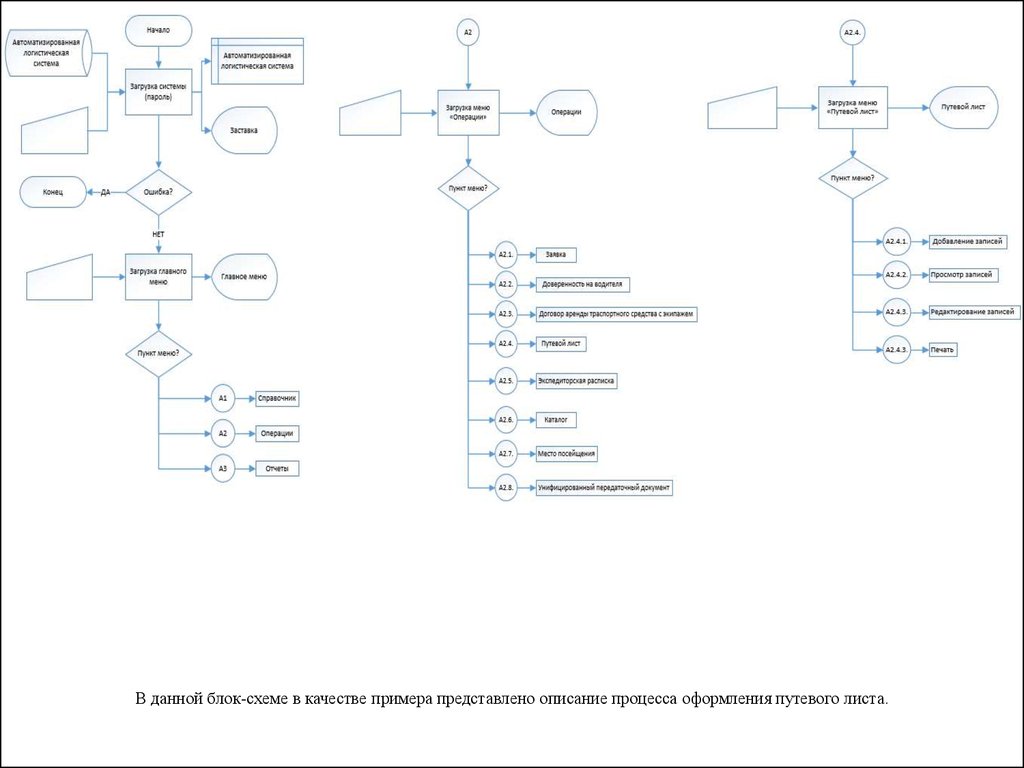 В данной блок-схеме в качестве примера представлено описание процесса оформления путевого листа.14.
