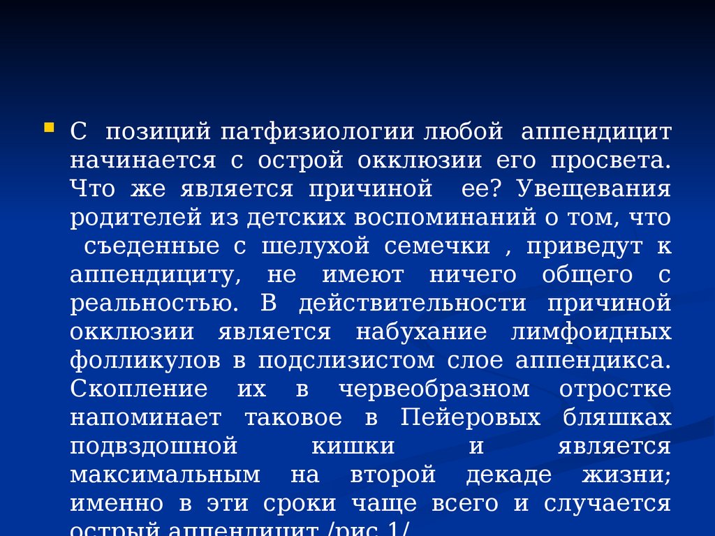 С позиций патфизиологии любой аппендицитначинается с острой окклюзии его просвета.