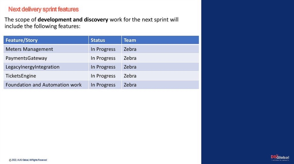 Next delivery sprint featuresThe scope of development and discovery work for the next sprint will