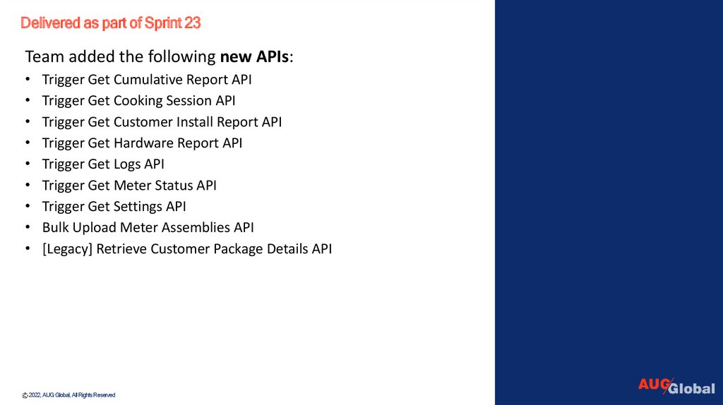 Delivered as part of Sprint 23Team added the following new APIs: