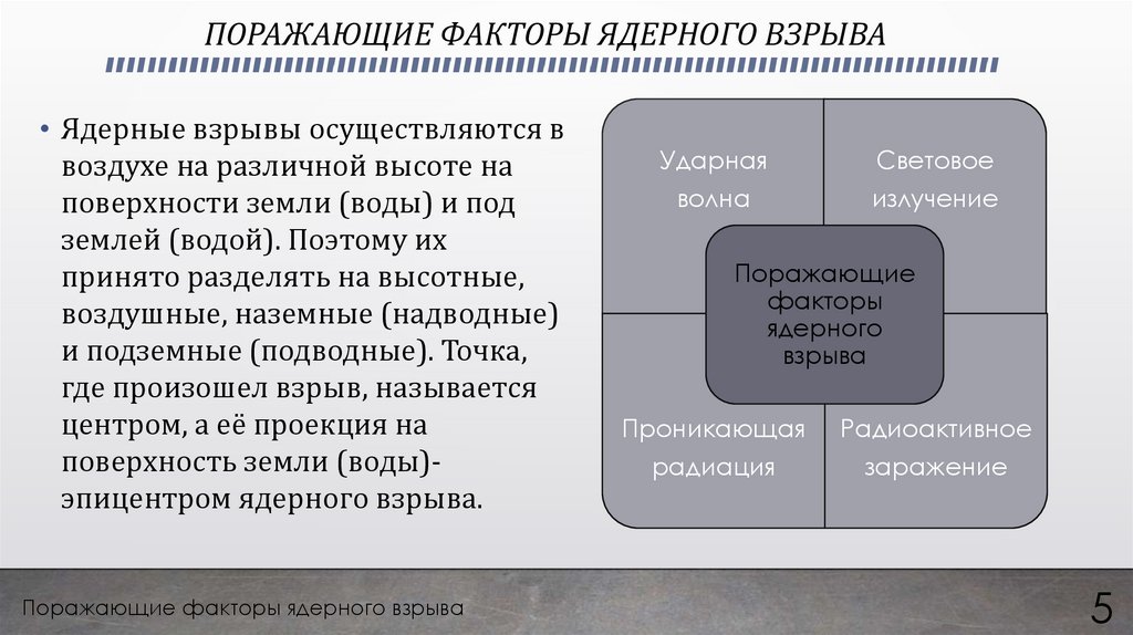 ПОРАЖАЮЩИЕ ФАКТОРЫ ЯДЕРНОГО ВЗРЫВА• Ядерные взрывы осуществляются в