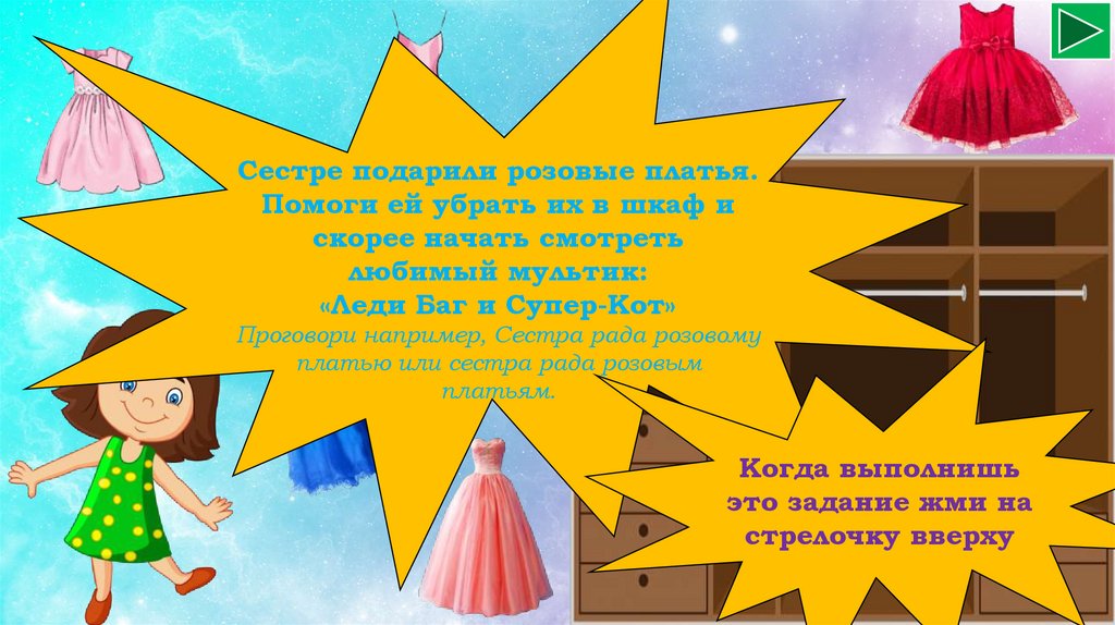 Сестре подарили розовые платья.Помоги ей убрать их в шкаф и