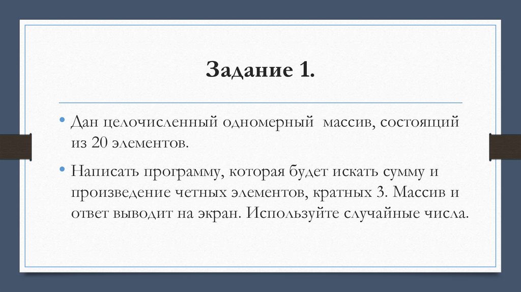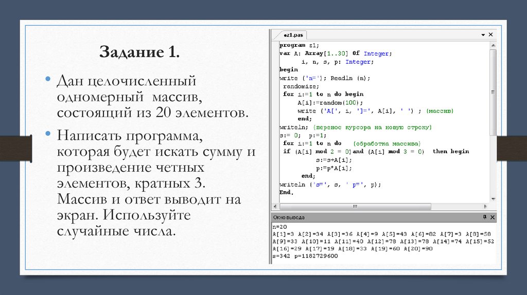 Задание 1.• Дан целочисленный одномерный массив, состоящий