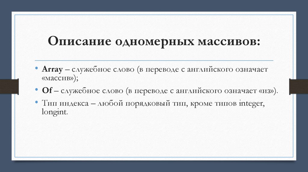 Описание одномерных массивов:• Array – служебное слово (в переводе с английского означает