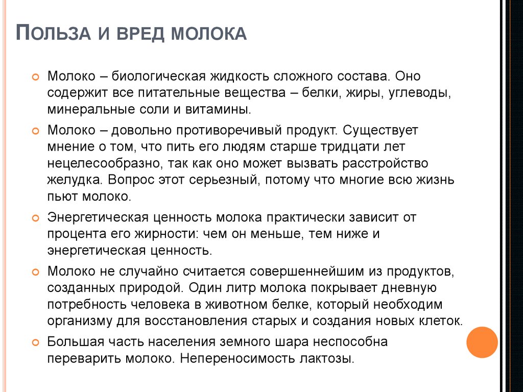 ПОЛЬЗА И ВРЕД МОЛОКАМолоко – биологическая жидкость сложного состава. Оно