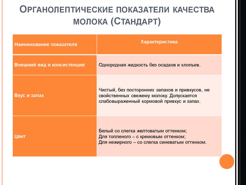 ОРГАНОЛЕПТИЧЕСКИЕ ПОКАЗАТЕЛИ КАЧЕСТВАМОЛОКА (СТАНДАРТ)
