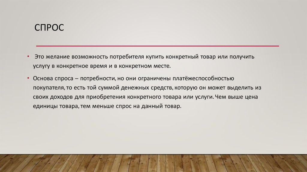 СПРОС• Это желание возможность потребителя купить конкретный товар или получить