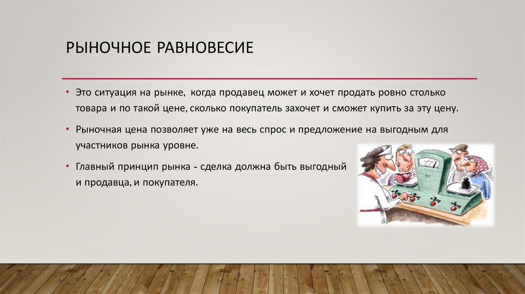 РЫНОЧНОЕ РАВНОВЕСИЕ• Это ситуация на рынке, когда продавец может и хочет продать ровно столько
