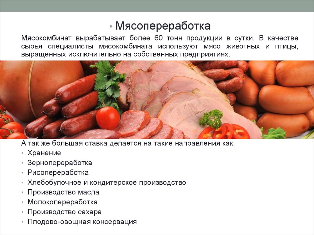 • МясопереработкаМясокомбинат вырабатывает более 60 тонн продукции в сутки. В качестве