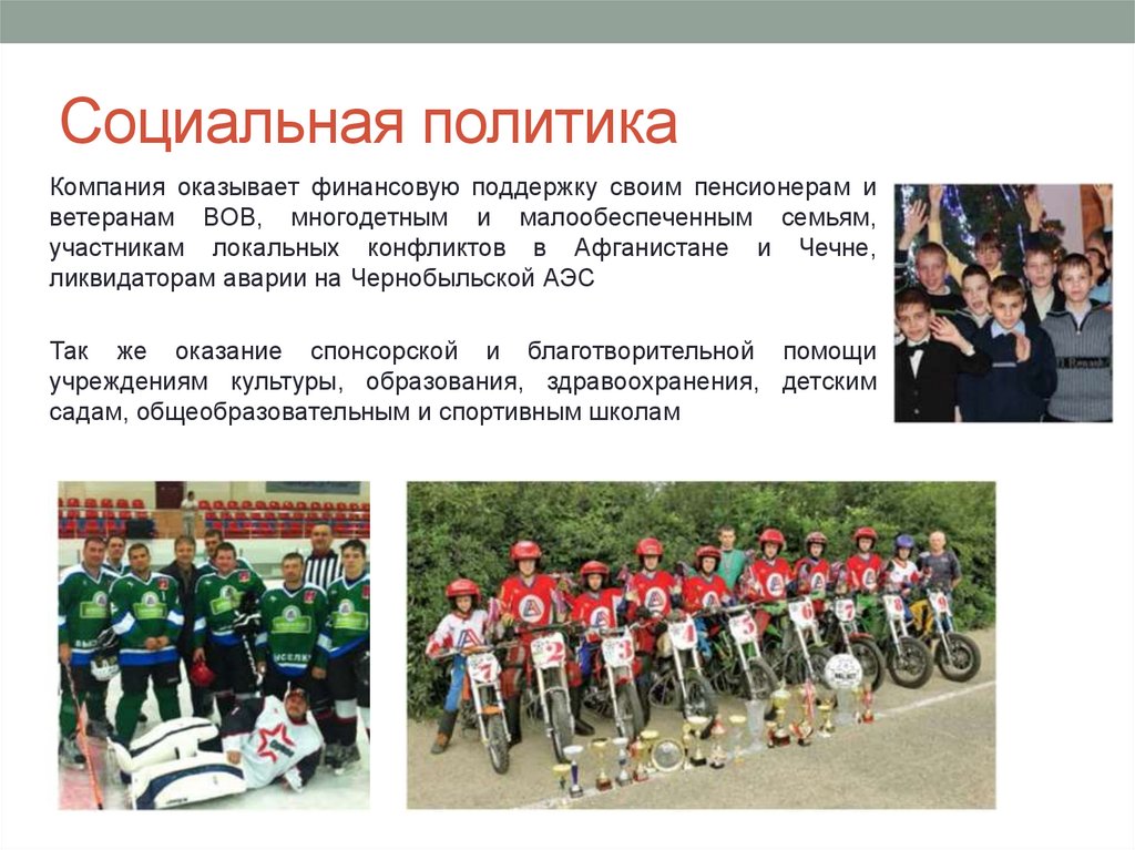 Социальная политикаКомпания оказывает финансовую поддержку своим пенсионерам и
