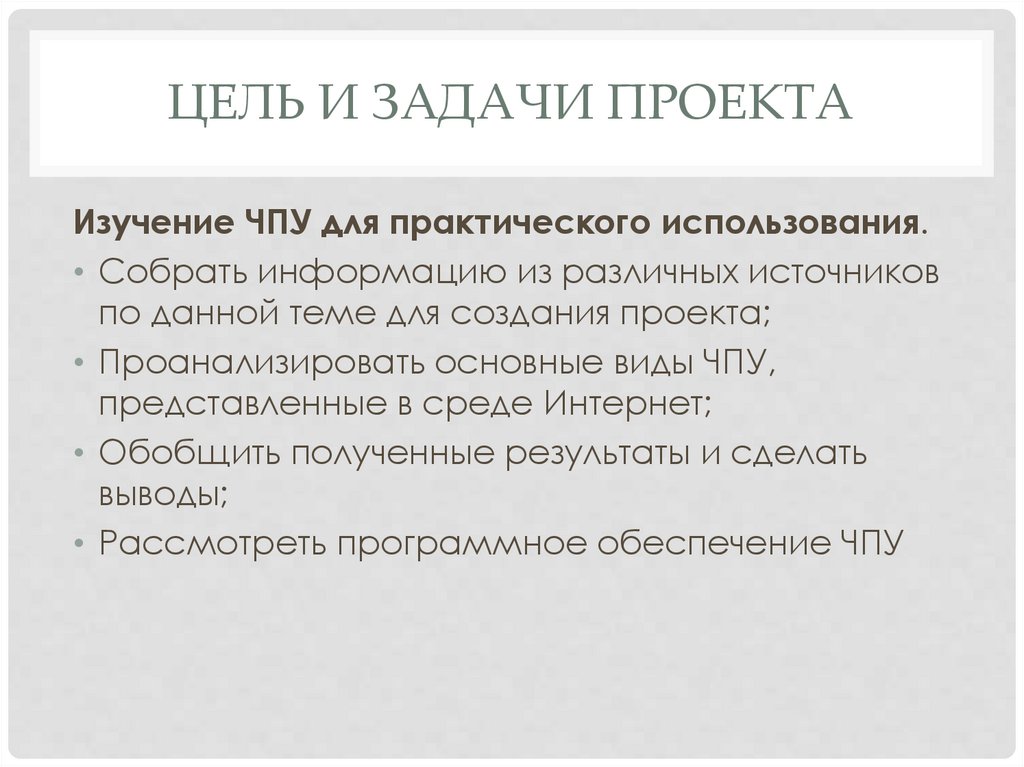 ЦЕЛЬ И ЗАДАЧИ ПРОЕКТАИзучение ЧПУ для практического использования.