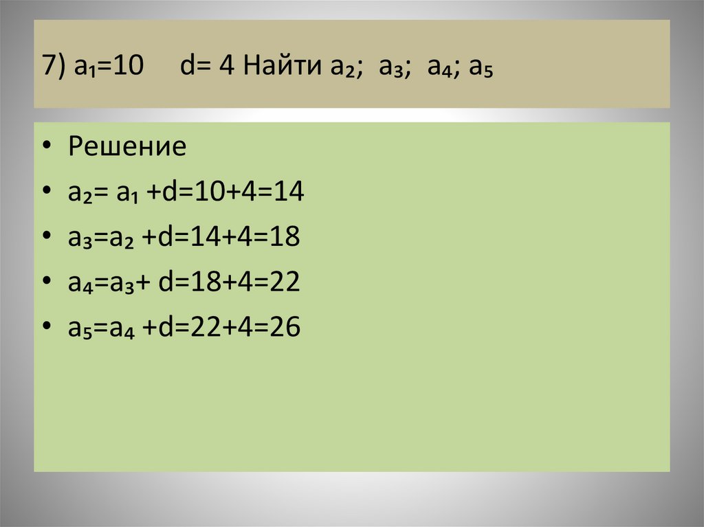 7) a₁=10d= 4 Найти а₂; а₃; а₄; а₅