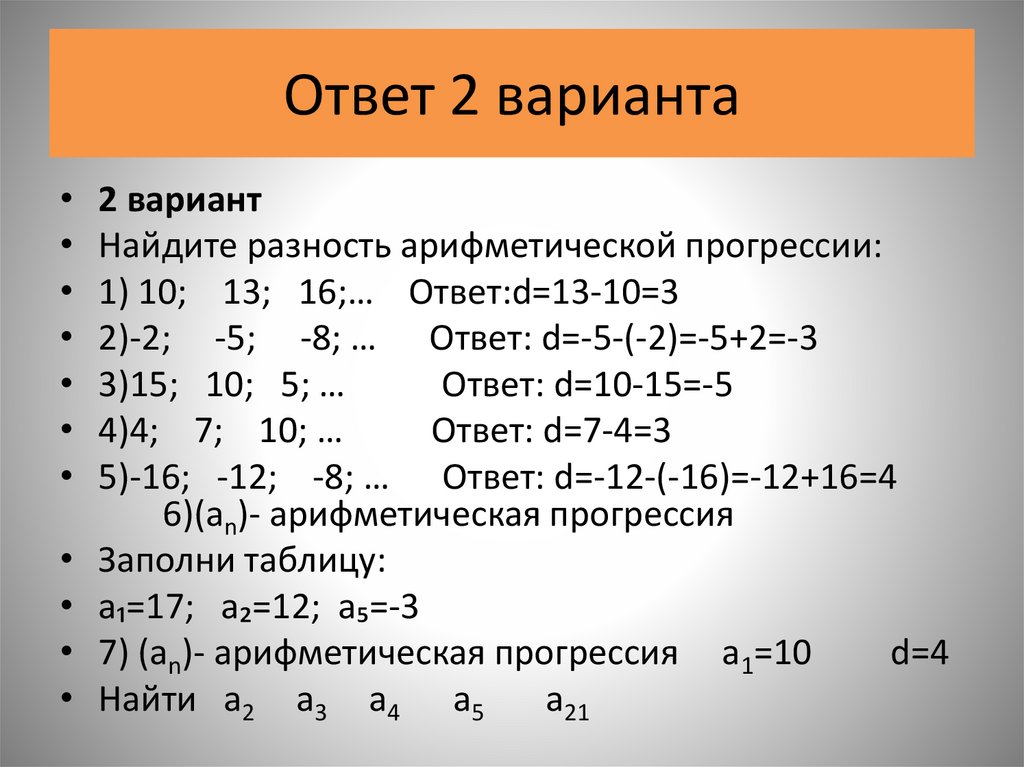 5)-16; -12; -8; … Ответ: d=-12-(-16)=-12+16=4