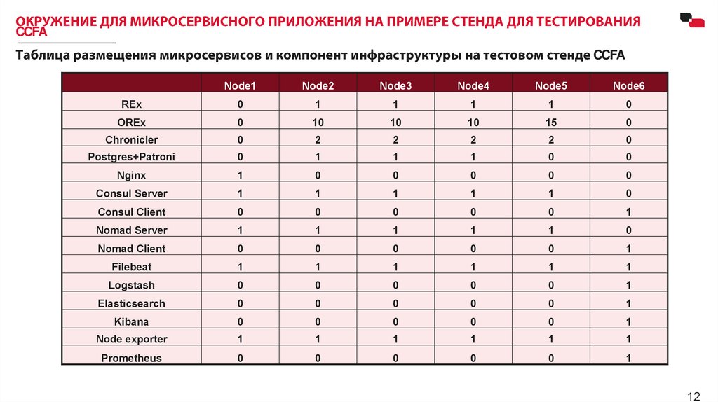• Таблица размещения микросервисов и компонент инфраструктуры на тестовом стенде CCFA