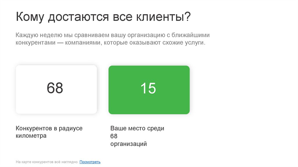 Кому достаются все клиенты?Каждую неделю мы сравниваем вашу организацию с ближайшими