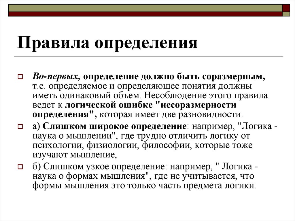а) Слишком широкое определение: например, "Логика наука о мышлении", где трудно отличить логику от