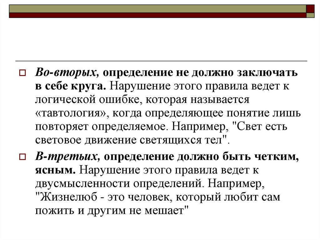 Во-вторых, определение не должно заключатьв себе круга. Нарушение этого правила ведет к
