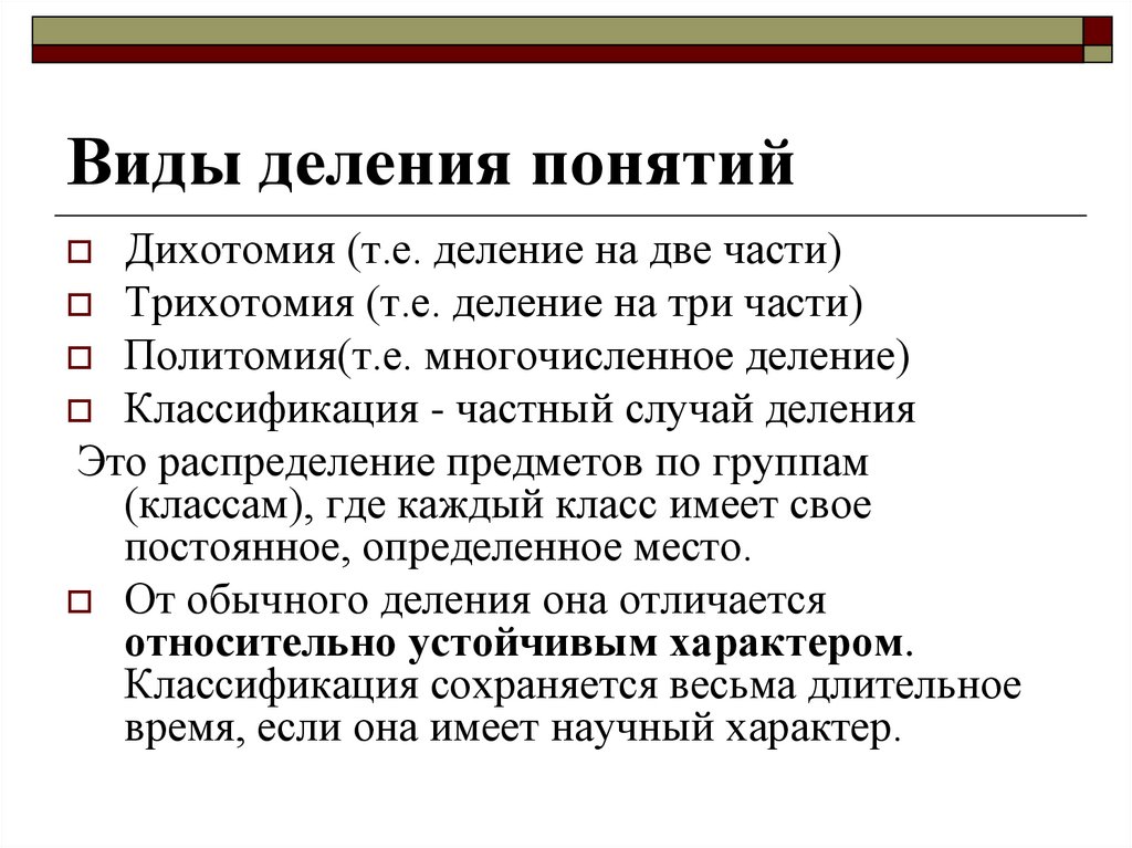 Виды деления понятийДихотомия (т.е. деление на две части)