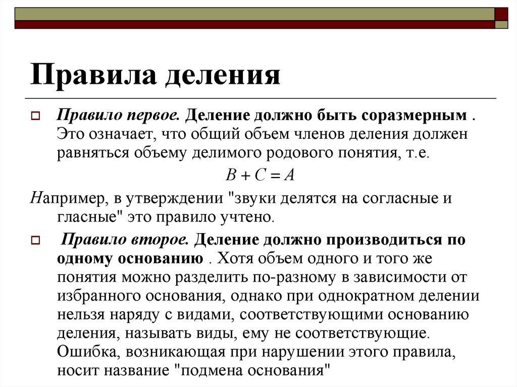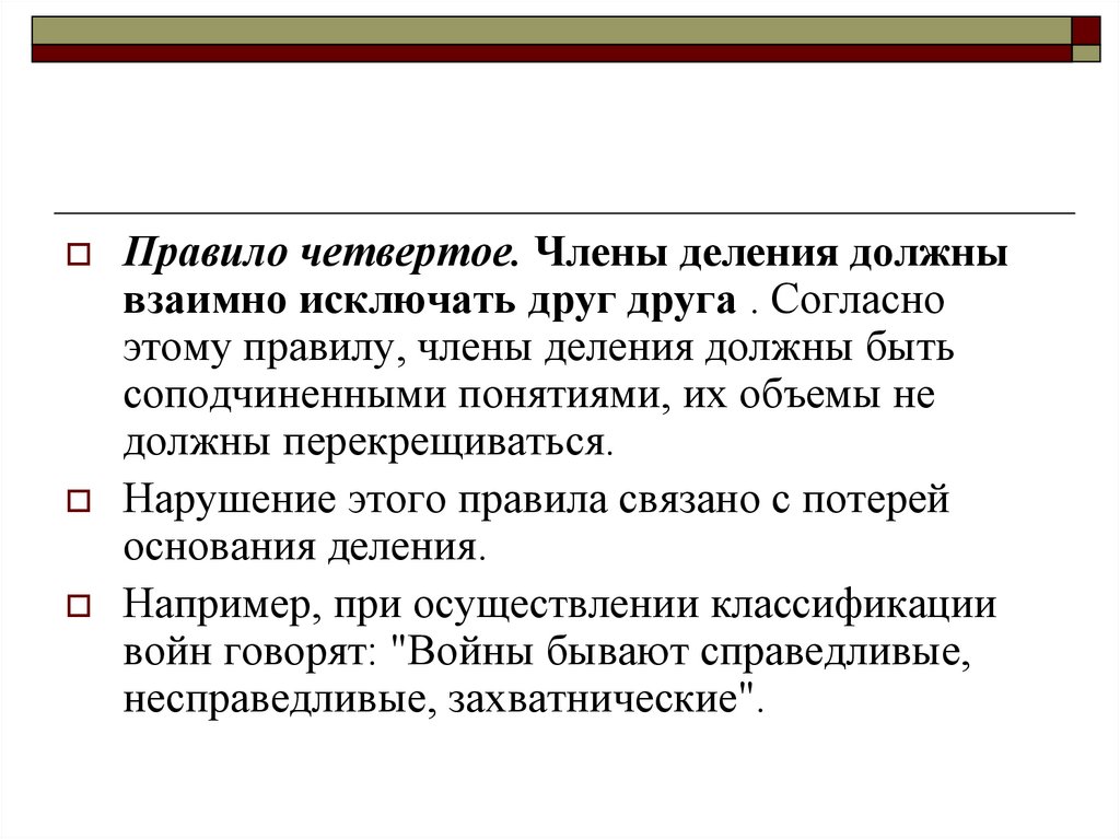 Правило четвертое. Члены деления должнывзаимно исключать друг друга . Согласно