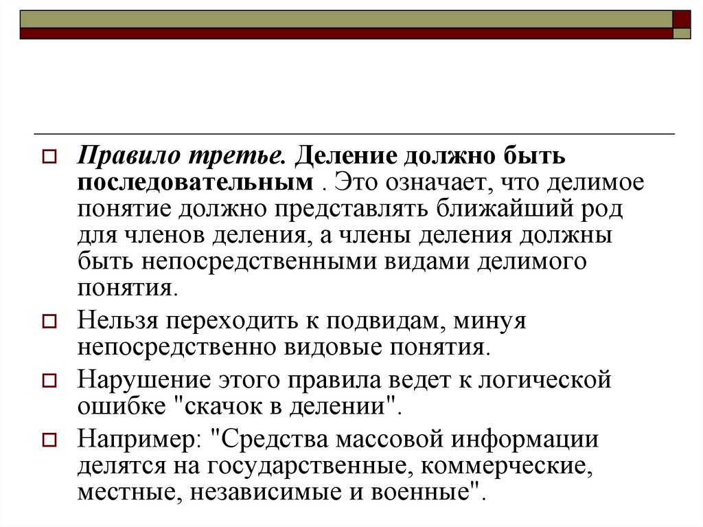 Правило третье. Деление должно бытьпоследовательным . Это означает, что делимое