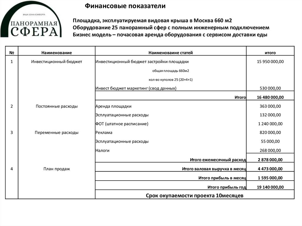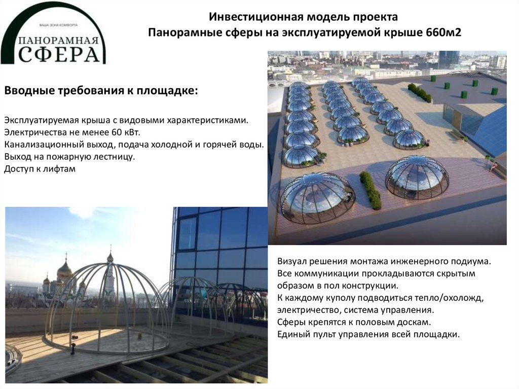 Инвестиционная модель проектаПанорамные сферы на эксплуатируемой крыше 660м2