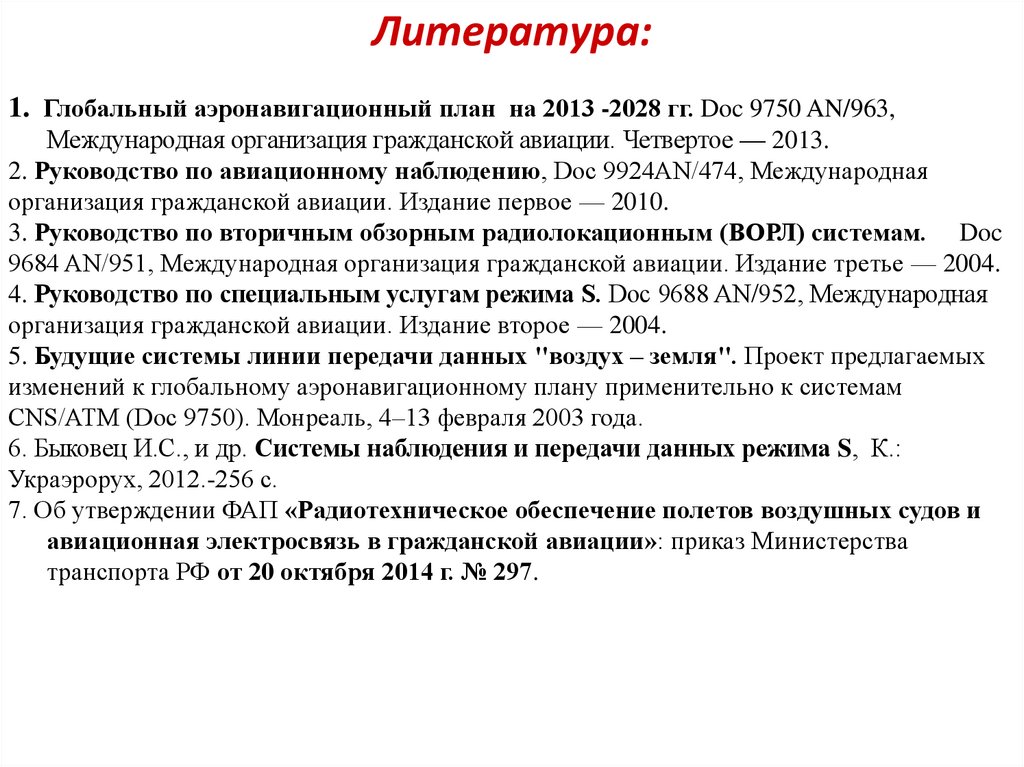 Литература:1. Глобальный аэронавигационный план на 2013 -2028 гг. Doc 9750 AN/963,