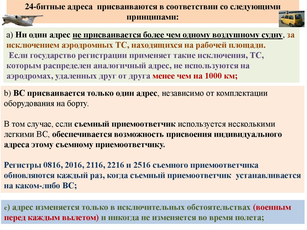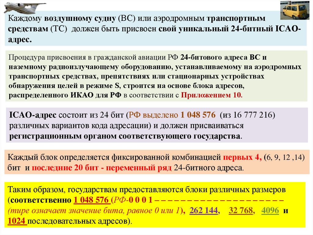 Каждому воздушному судну (ВС) или аэродромным транспортнымсредствам (ТС) должен быть присвоен свой уникальный 24-битный ICAOадрес.