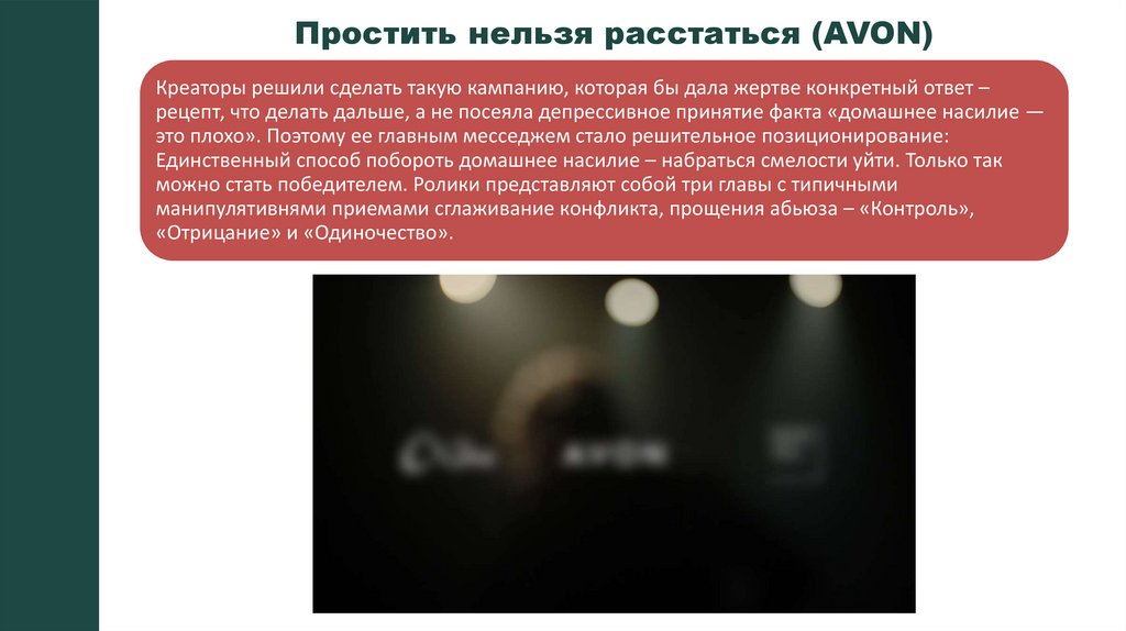 Простить нельзя расстаться (AVON)Креаторы решили сделать такую кампанию, которая бы дала жертве конкретный ответ –